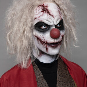 | メッセージ | 和と洋を掛け合わせた作品を作りたいと思い、袴を身につけた和風のピエロを制作しました。ピエロの顔の皮膚はお面のような硬い素材の設定なので、硬い素材のものにヒビが入ってボロボロと砕けている表現を彫刻で時間をかけて頑張りました。 |