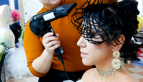 様々な映像メディアや、ステージに出演するモデル・俳優のヘアメイクは、その作品の完成度を左右するほどのチカラをもっていることがあります。映像・舞台メイク専攻ではヘアーアレンジやメイク技法に加えて、ボディペイントやピース(皮膚に貼り付けるパーツ)作成、かつら制作に必要な毛編みまで幅広く学び、市場価値の高い人材育成に取り組んでいます。
