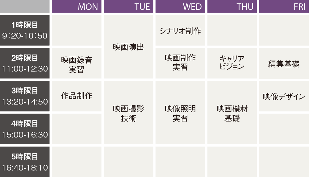 カリキュラムはあくまで実習がメイン。2年間を通じて、個人やグループで様々な映像制作に取り組み、現場で求められる想像力・表現力・対応力・コミュニケーション能力を磨いていきます。