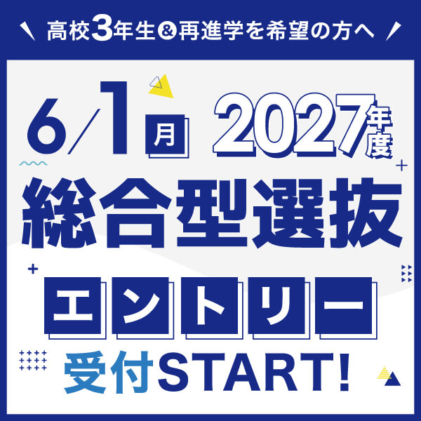 2026/04/14 入学検討者【2027年4月入学】総合型選抜(AO入学)エントリー【6/1(月)】スタート!総合型選抜(AO入学)のメリット&スケジュールを確認しよう!新・高校3年生の皆さん!再進学をご検討の皆さん!6/1(月)から、2027年度 総合型選抜(AO)エ…
