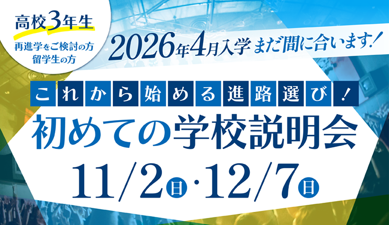 2025/10/28 入学検討者【高校3年生の方・再進学を検討している方向け】これから始める進路選び!はじめての学校説明会次の進路決定を迷っている高校3年生の方、エンタメ業界に興味があるけどまだ来校したことがない方、注目!…