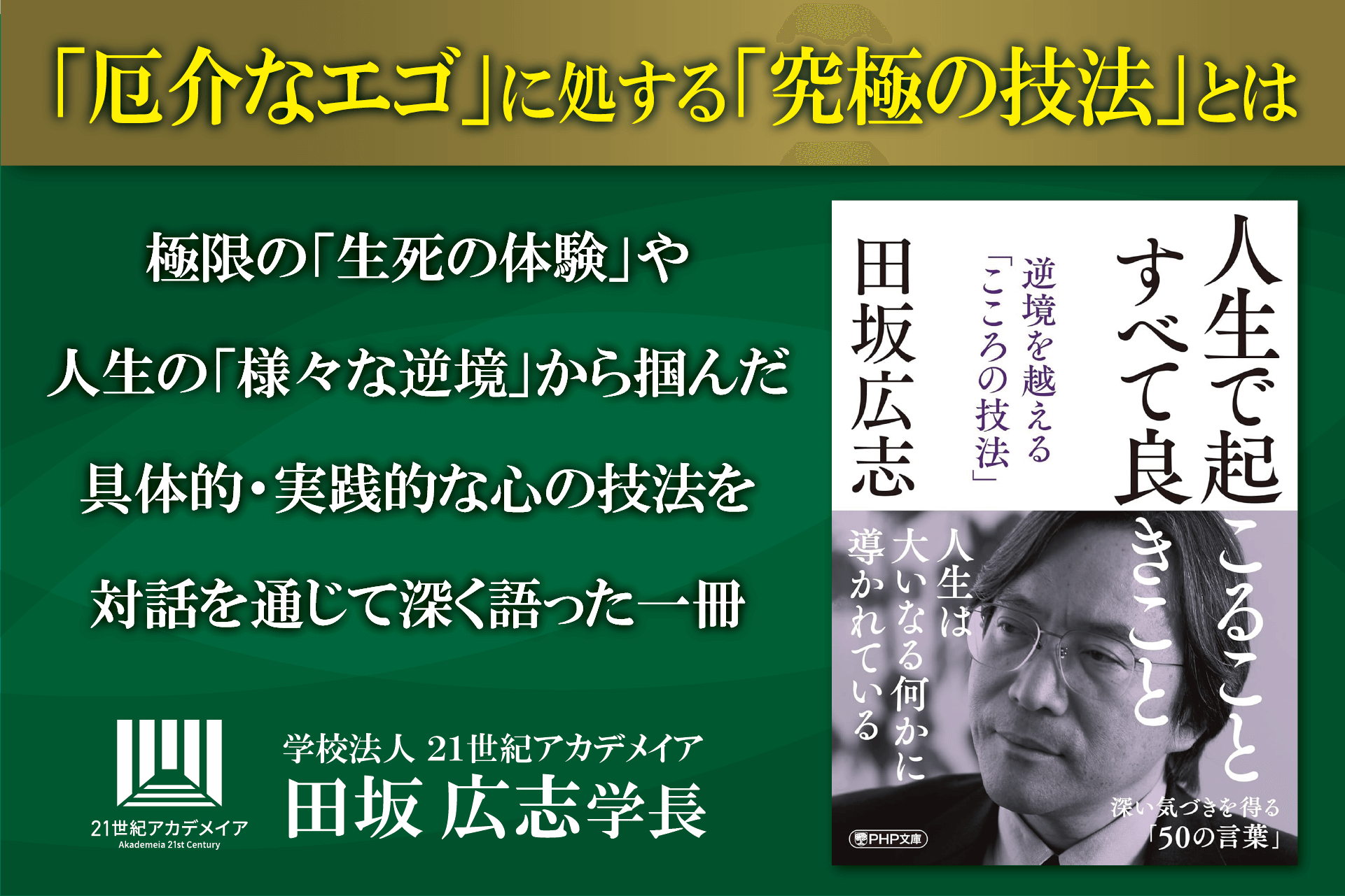2025/05/23 その他【著書公開】田坂広志学長の人生論対話『人生で起こること すべて良きこと』が文庫化。人間関係の悩みの原因となる心の中の「厄介なエゴ」。そのエゴに処する「究極の技法」を公開著書公開はこちらから 本書のアマゾンサイトはこちら 田坂広志アカデメイア 公式HP 学校法人 2…