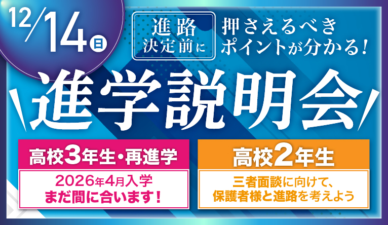 参加予約はこちら202512/07Sun【高校3年生・再進学を検討中の方向け】これから始める進路選び!はじめての学校説明会